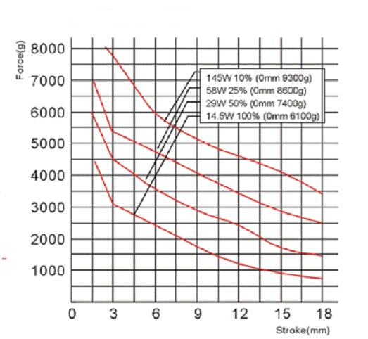縱向:代表電磁鐵在對應(yīng)行程時的力量 單位為克(g)